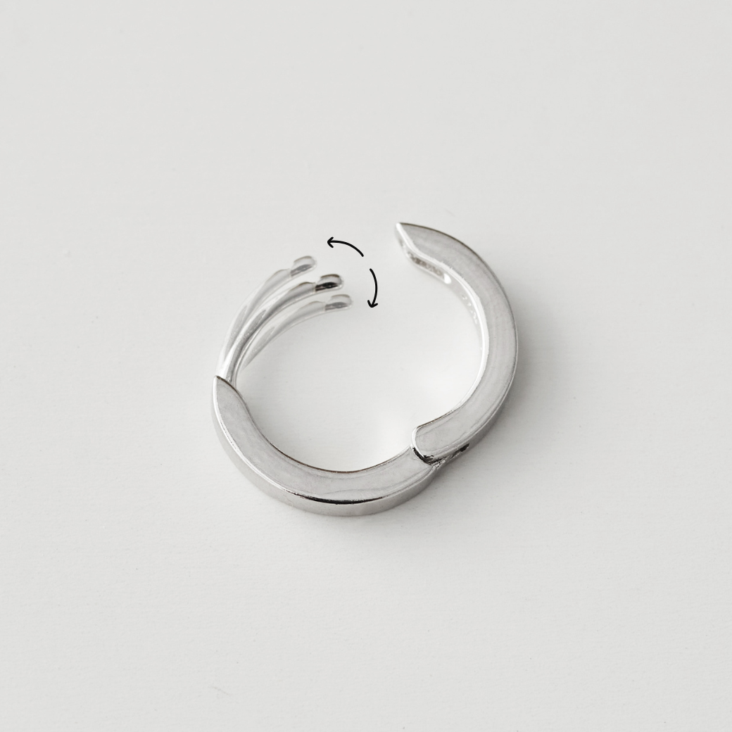在長時間配戴的過程中,金屬因輕壓或日常動作,可能使耳針角度略有偏移,導致扣合暫時不易。這是純銀自然的彈性反應,只需輕輕向外或向內微調耳針角度,即可恢復扣環的緊密度。細心調整後,即能再次穩固佩戴,讓耳環長久陪伴而不易損壞。